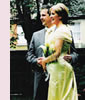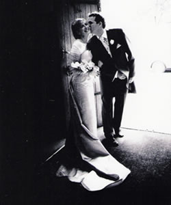 Susan, an actress and dancer, wanted something "simple, but knockout" when she married David. We chose a simple column dress with detachable train, and a thigh-high split so she could dance through the night!